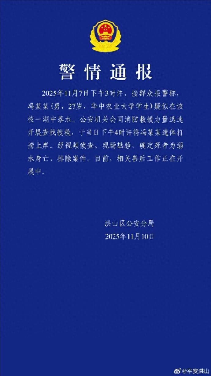 11月10日,平安洪山官博发布警情通报,内容如下: 2025年11月7日下午3时许,接群众报警称,冯某某(男,27岁,华中农业大学学生)疑似在该校一湖中落水。公安机关会同消防救援力量迅速开展查找搜救,于当日下午4时许将冯某某遗体打捞上岸。经视频侦查、现场勘验,确定死者为溺水身亡,排除案件。目前,相关善后工作正在开展中。 ![]() 据潇湘晨报此前报道,近日,有网友在社交媒体发文称,自己的弟弟在华中农业大学的生物化学与分子生物学专业就读博士,结果却意外溺亡。华中农业大学的作物遗传改良全国重点实验室工作人员告诉记者,事发于11月7日,现在学校已成立专班在处理此事。 来源 平安洪山、潇湘晨报 |